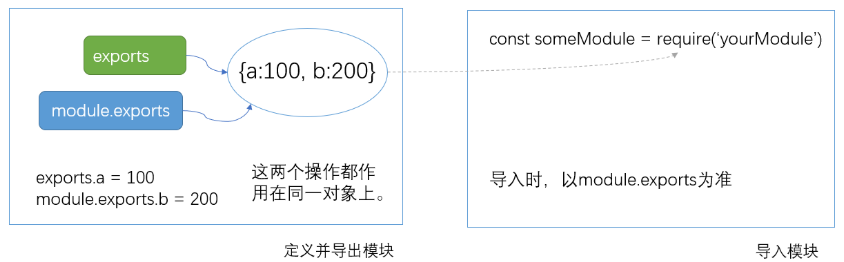 exports和module.exports是指向同一块内存区域,其内容都是一个空对象。(exports是module.exports的别名)即:exports === module.exports // 输出是 true